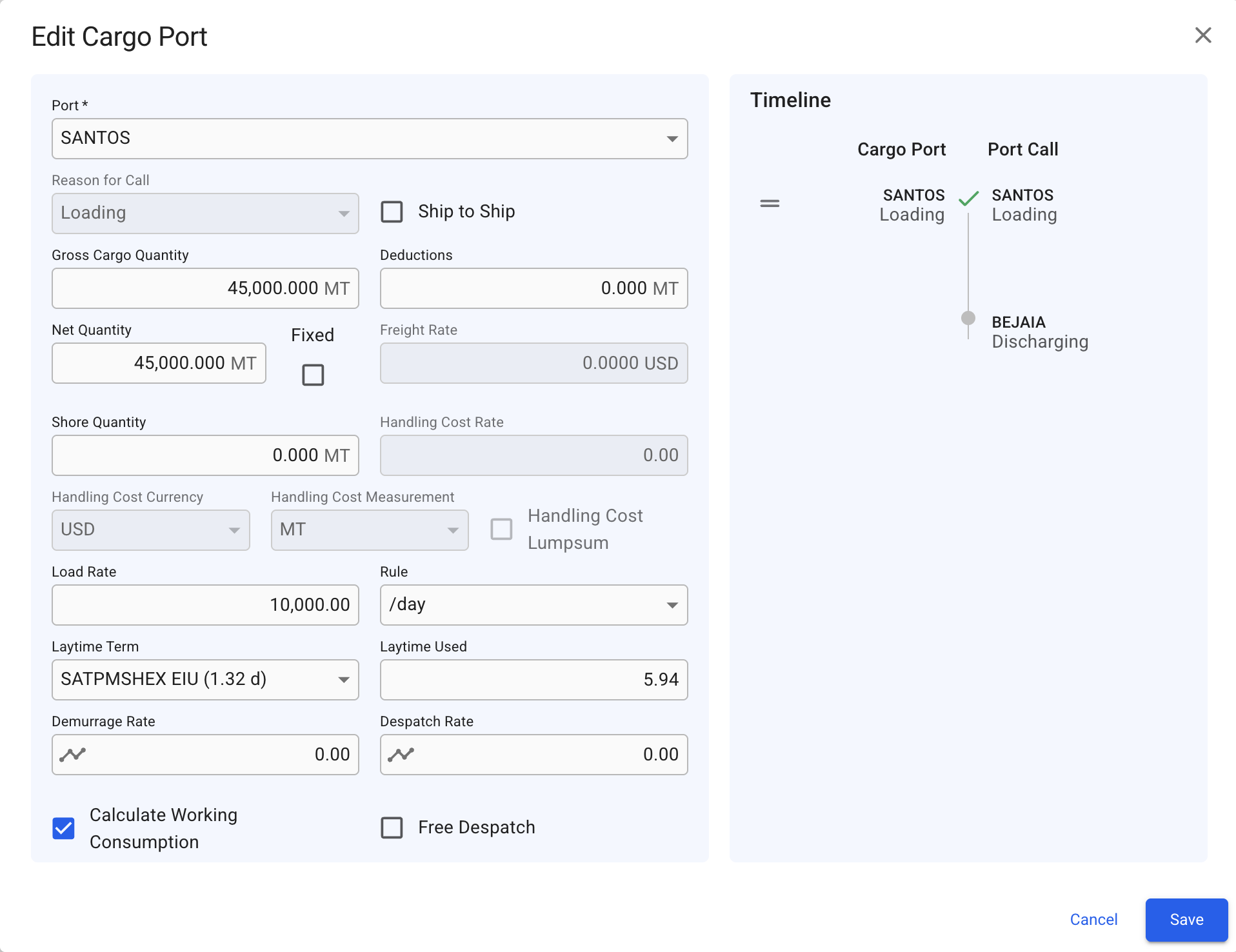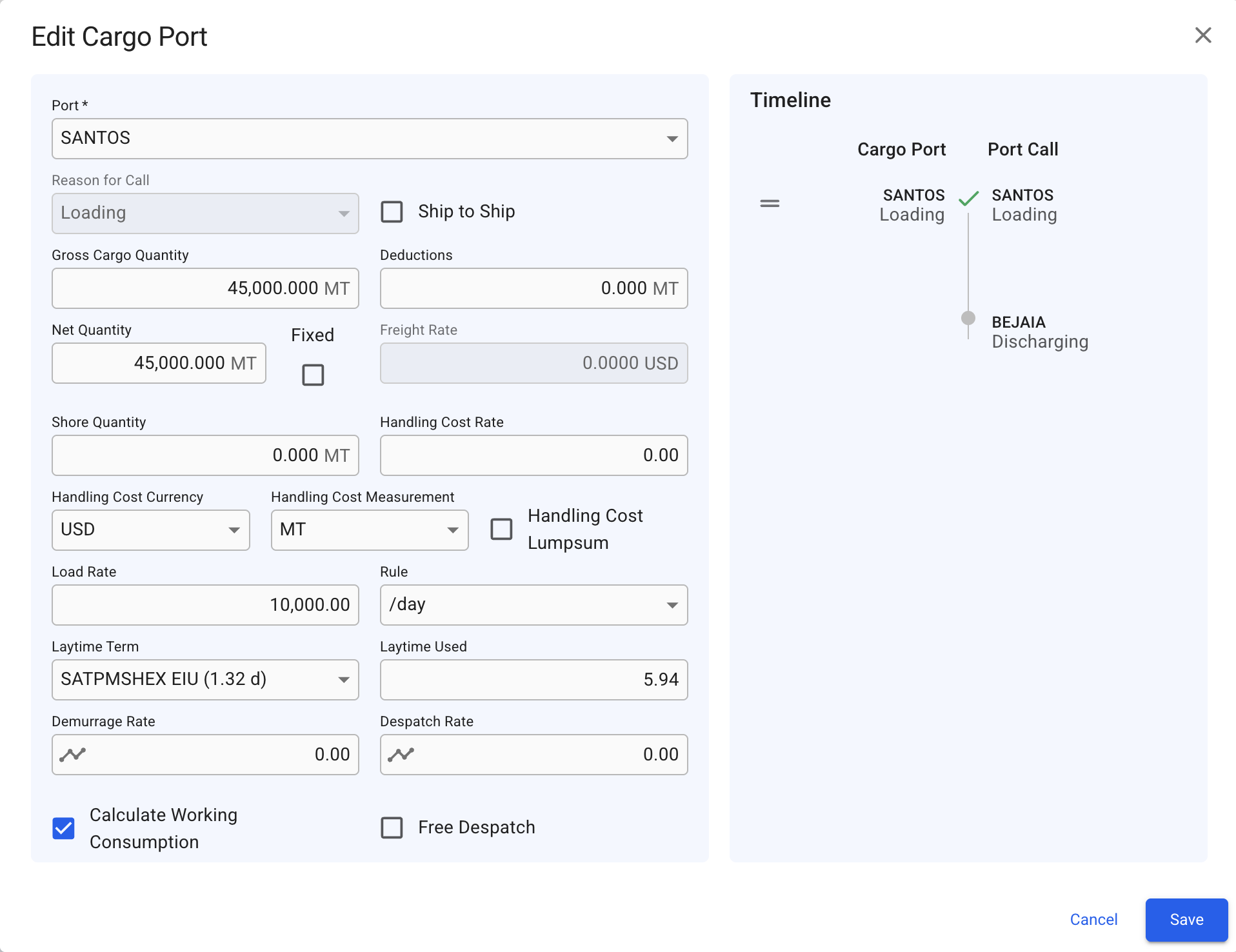Editing a Cargo Port will give you access to a few more fields, for instance Handling Cost, Laytime Terms, etc.: