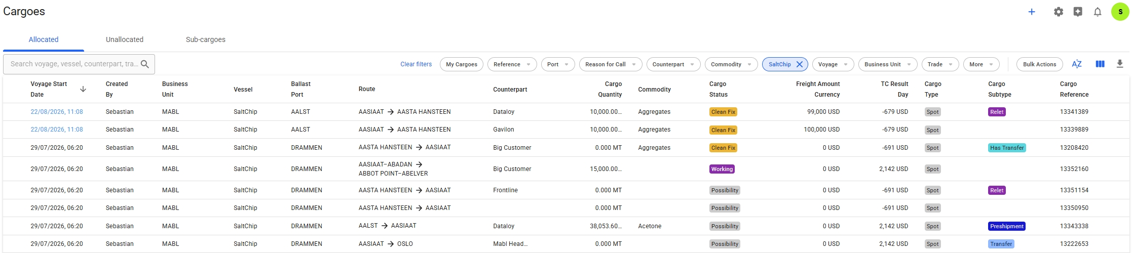 The Cargoes page is designed to be able to show the history of cargoes by setting filters and customising columns to your needs.