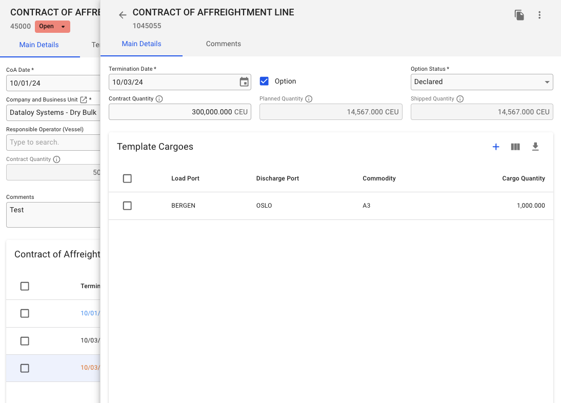 Also, by clicking the ![](https://content.gitbook.com/content/WoySkL2wtBxvxqGI8yWa/blobs/z8PaYqZF71Dm9ZBUIFvF/image.png)-icon, it is possible to copy the selected Template Cargo. Which will then be connected to the same CoA Line.&#x20;