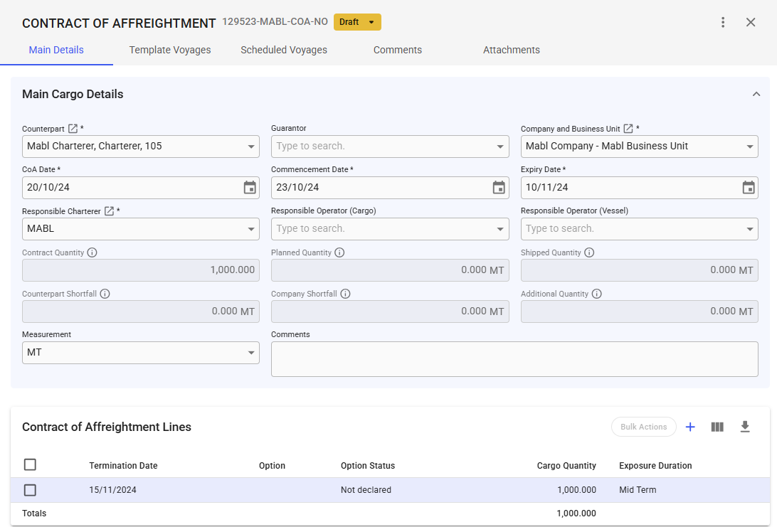 In the Main Details tab, you can specify the details of the contract (CoA), such as CoA Date, Company & Business Unit, etc., view calculated fields such as Planned- and Shipped Quantities, and see all CoA Lines connected to this contract: