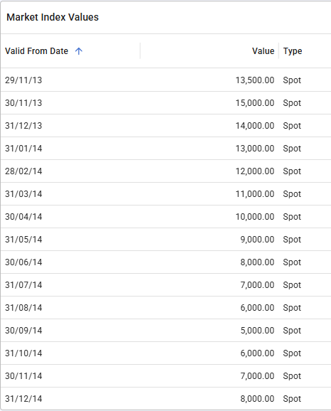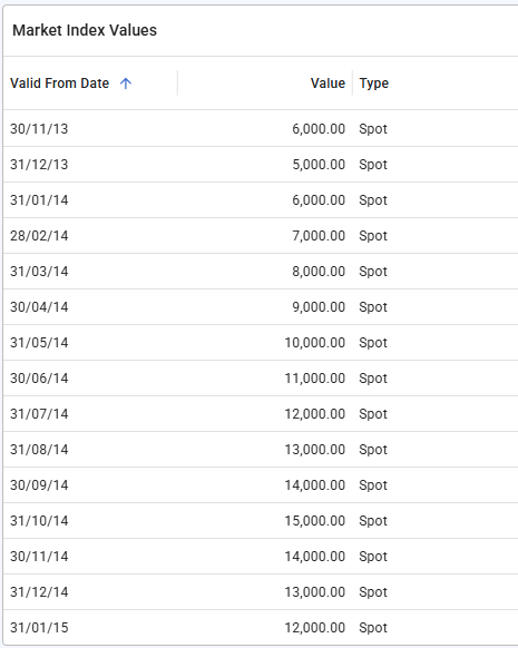 When the custom market index containing these two market indices is generating its own market index values it groups every market index value by its valid from date. This would create a map where 29/11/13 would have only the market index value from P4A_03, 30/11/13 would have the 6000 market index value from P2A_03 and the 15000 market index value from P4A_03, etc.
