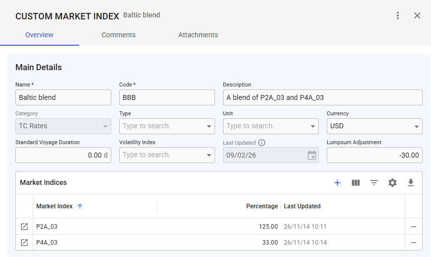 A custom market index is a weighted combination of one or more market indices. Each included index is assigned a percentage weight.