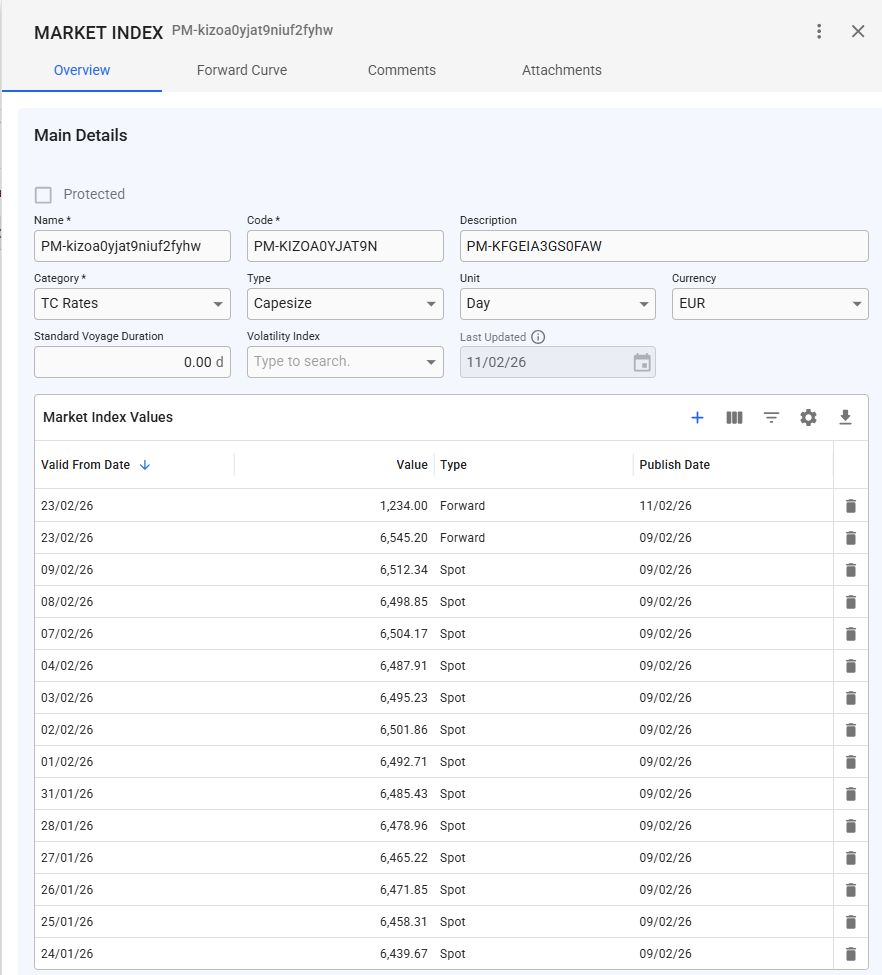 The overview tab gives you access to the details of the market index, as well as a list of spot and current forward-curve market index values. You can read more about the grid's functionalities here.