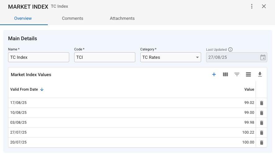 For each market index, you can view a list of the connected market index values. On the below grid, you can view, edit, create, delete, sort, filter, customise/search for and export market index values for each row: