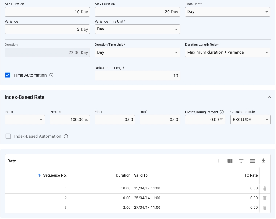 E.g., take the below example; if time automation is enabled, the duration length rule will become Maximum Duration + Variance*, which is here 20 days + 2 days = 22 days under duration. Since default rate length is now enabled, we can now override the defaulted 22 days, to e.g. 10 days: