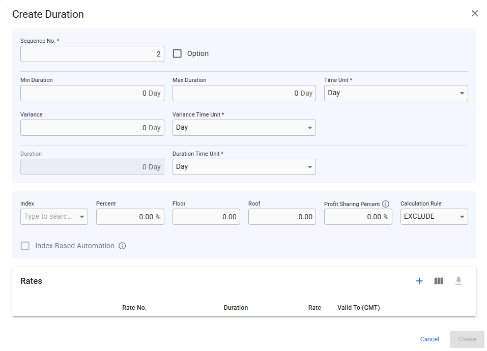 In the second section, the duration itself is calculated based on the rule selected in the Duration Length Rule dropdown menu, with the default rule being Sum of all TC Rates. You can select the duration's time unit as well. All of the units can be of type 'Day' or 'Month'.