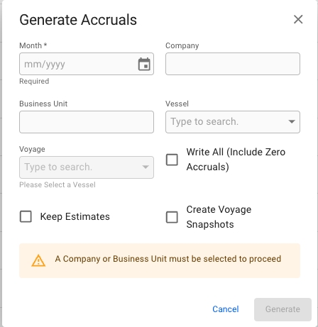 When clicking the Generate button in the top left corner, a modal will appear where you can select month/year, company, business unit, vessel and voyage fields as well as check off boxes for Write All, Keep Estimates and Create Voyage Snapshot to generate bunker stock adjustments.