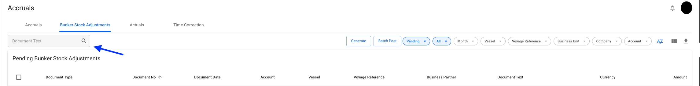 The search bar enables searching for Bunker Stock adjustment by Document text. The search is not case-sensitive and will return all Adjustments with Document Text containing the entered search text.