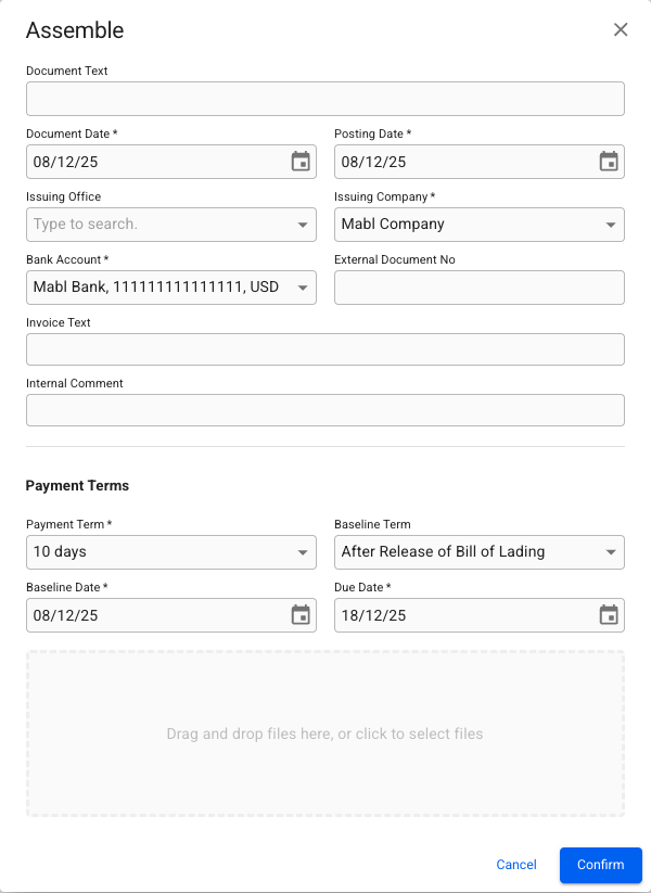 An assemble modal will open and some of the fields will be pre-filled. Make sure all mandatory fields (marked with *) are entered. At this stage, you may change the posting date of the invoice. If you choose a date earlier than the previous accounting month, an additional confirmation is required.