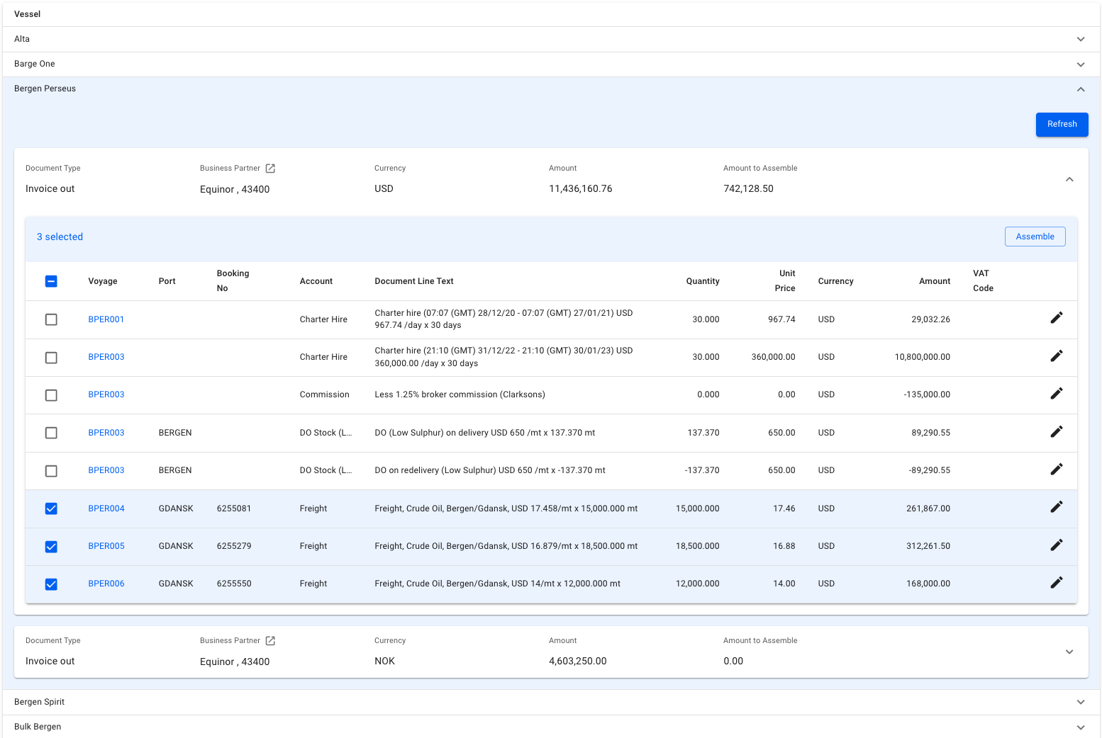 Clicking the Refresh-button on a Voyage or Vessel will first delete all existing Document Lines, then re-generate new lines with updated values. Any changes made using the Edit Document Line modal will thus be lost!