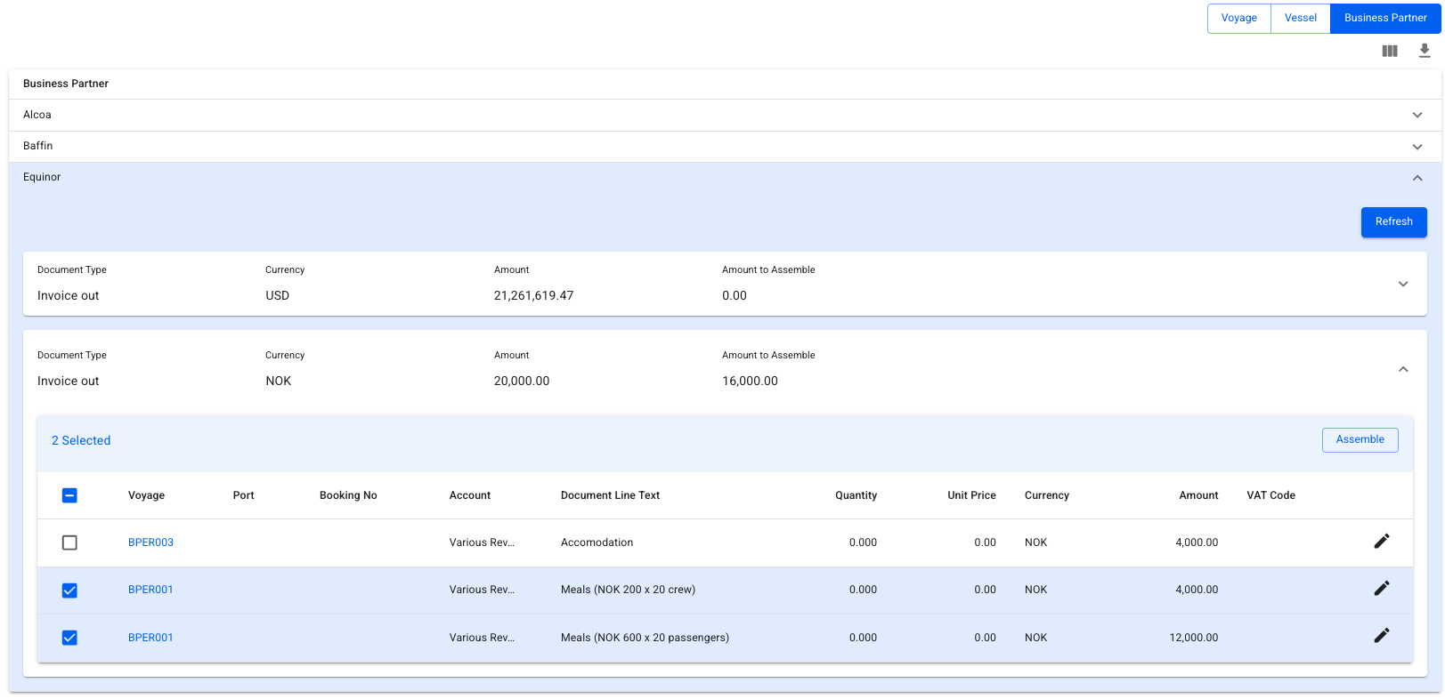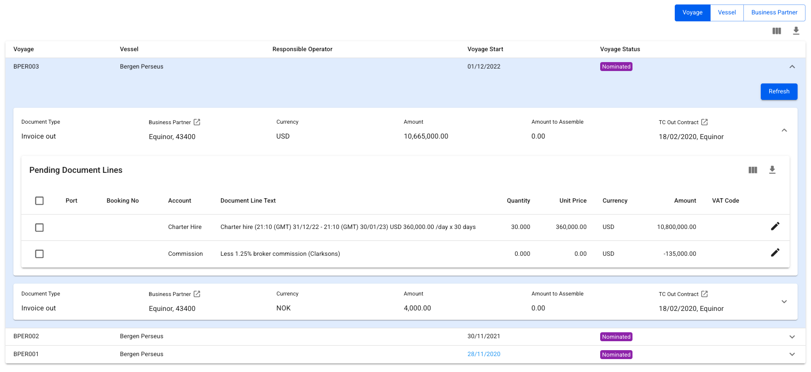 In this view, a list of voyages will be displayed, alongside the vessel, operator, start date and voyage status. Clicking on a line will open up a new grouping of Business Partners and Currency, from which document lines can be selected, edited and assembled into a document.