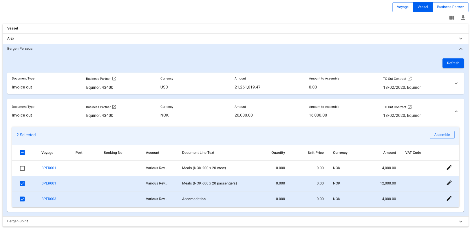 In this view, a list of vessels will be displayed. Clicking on a line will open up a new grouping of Business Partners and Currency. Difference being, we can now see and choose lines from several different voyages, and assemble them all into one invoice.