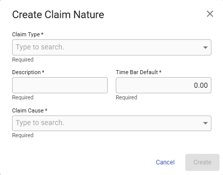 To create a new Claim Nature, click the blue plus button in the top-right corner of the page. When clicked, a modal will appear where you can select the claim type, enter a description, set the default time bar, and choose the cause of the claim ( see Figure 3 ).