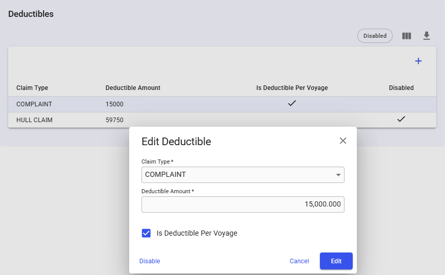 Editing a deductible works similarly. In the deductibles list, click on the deductible you want to modify. This opens an edit modal where you can make the necessary changes. Additionally, you can enable or disable the deductible. Disabled deductibles are clearly marked with a check icon in the list to indicate their status (see Figure 6).