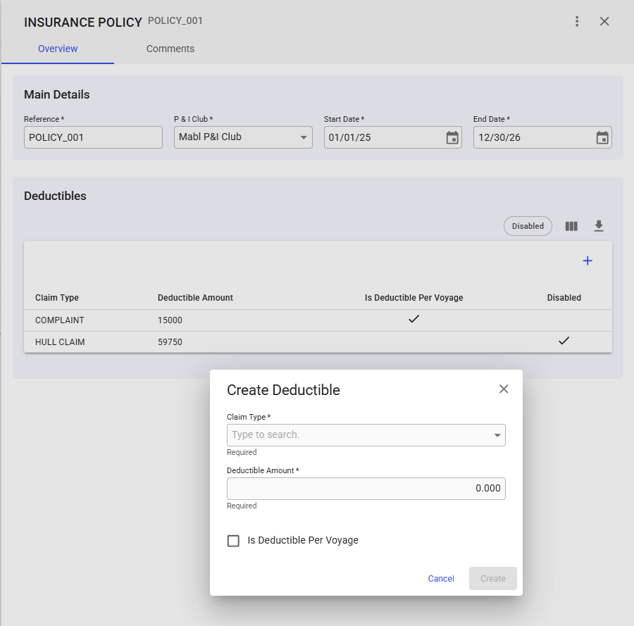 A deductible includes a type, a deductible amount, and an optional setting that indicates whether it applies per voyage. To add a deductible to an existing policy, first open the Insurance Policy Drawer by clicking on the corresponding row in the list. Then, in the deductibles section, click the blue plus sign at the top-right of the deductibles list to open the creation modal. Here, you can fill in the relevant information and confirm the entry.