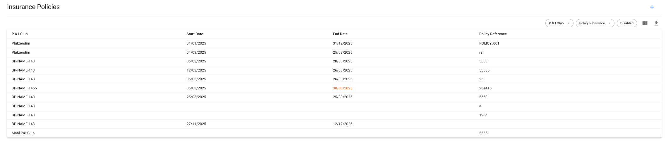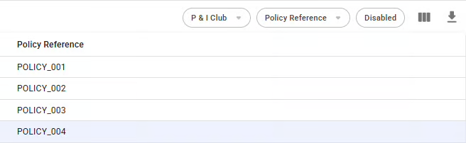 To help manage and locate insurance policies efficiently, [quick filters](https://docs.dataloy.com/voyage-management-system/sorting-and-filtering-lists#quick-filters) are available in the top-right header. These filters allow you to narrow down the list based on P\&I Club, Policy Reference, or whether the policy has been disabled. You can use more than one filter at a time to refine the list further.&#x20;