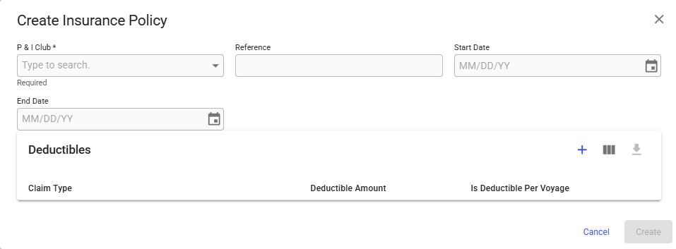 To create a new insurance policy, click the blue plus sign located in the top-right corner of the page (refer to Figure 1). This opens a modal where you can enter the necessary details. The P\&I Club is a required field, and at least one deductible must be added before creating the policy. Within this modal, you can also create new deductibles by clicking the "Create" button in the header of the deductibles list (see Figure 2).