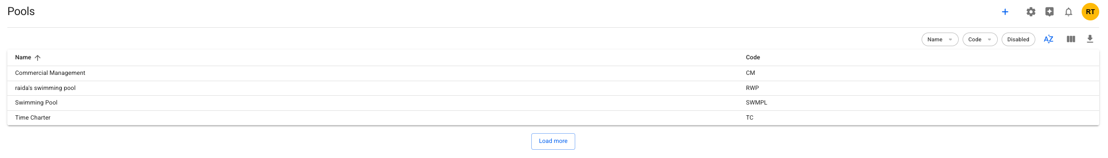 There are three quick filters top right. The first one filters on code, the second on name, and the last one is a 'Disabled' filter, that makes the list display disabled pools when enabled.