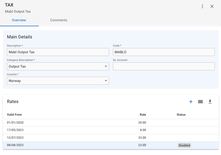 If you uncheck the Enabled checkbox, the tax rate will get the status Disabled on the list.