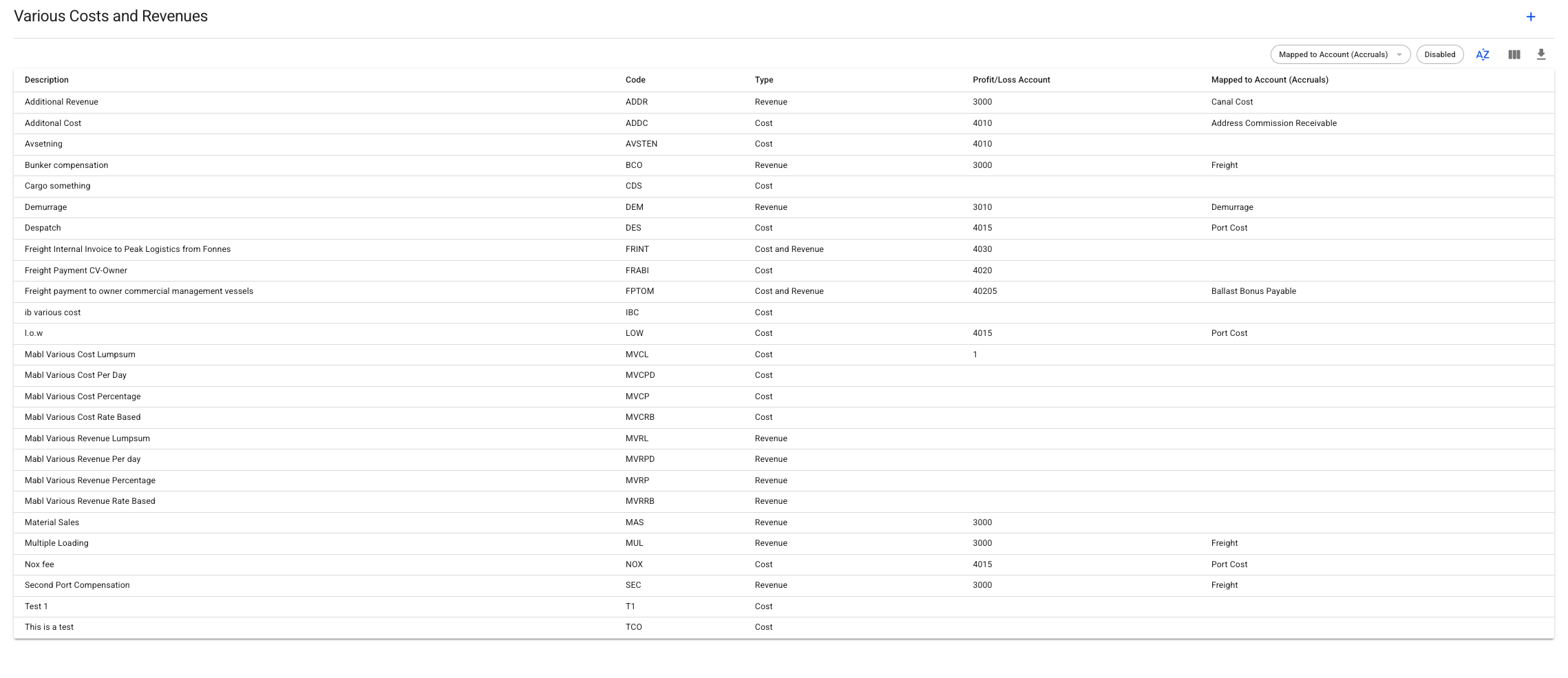 Opening the "Various Cost and Revenues" module under "Master Data" will show a list of all available various cost/revenue.
