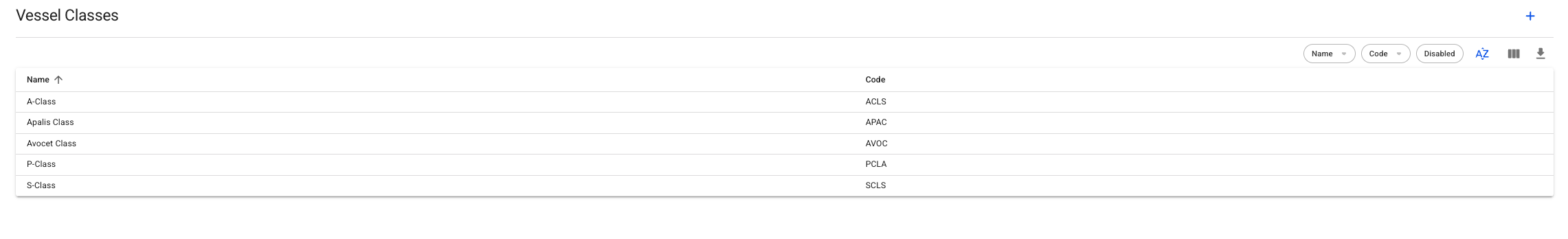 There are three quick filters top right. The first one filters on code, the second on name, and the last one is a 'Disabled' filter, that makes the list display disabled vessel class when enabled.