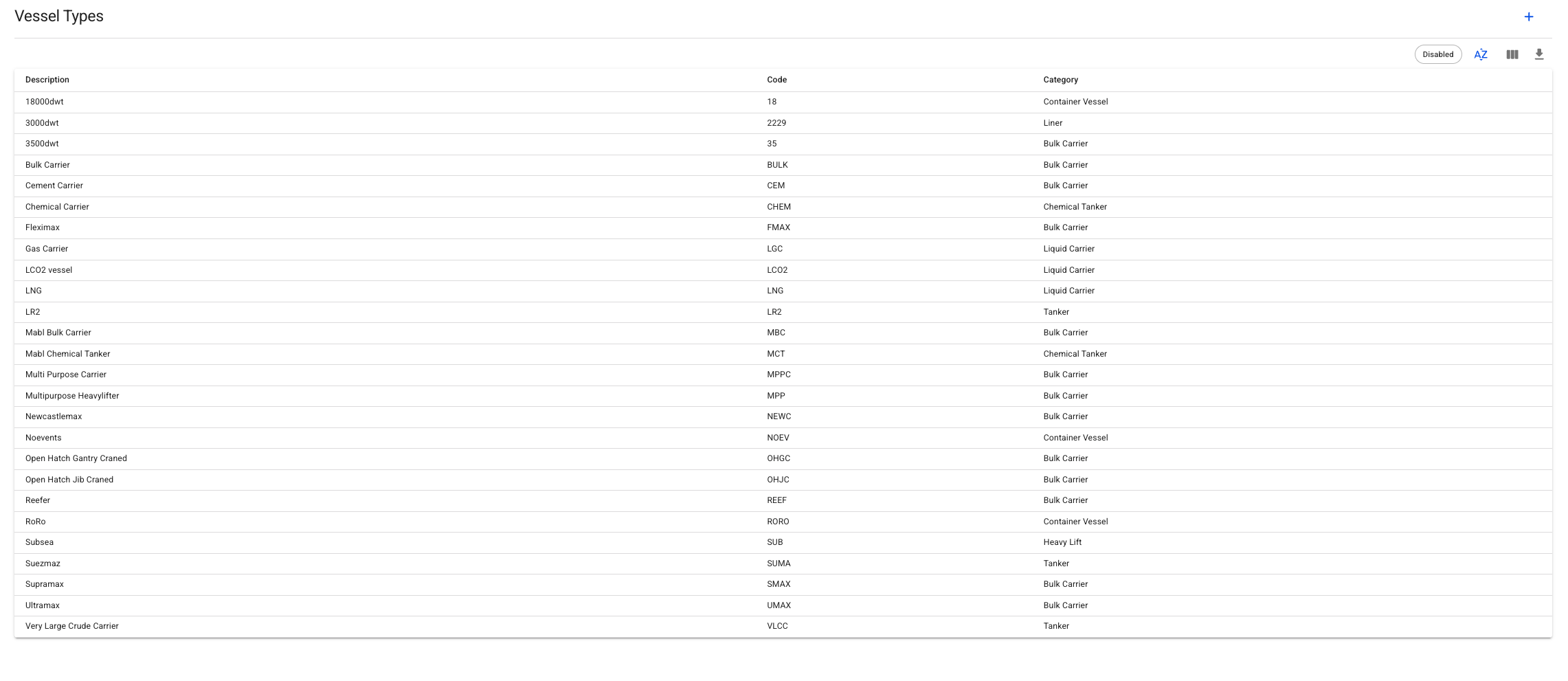 The list shows you an overview of all available Vessel Types. The usual array of list options are available, such as sorting, re-ordering, and column customisation. Clicking on a Vessel Type will open up the Vessel Type drawer.