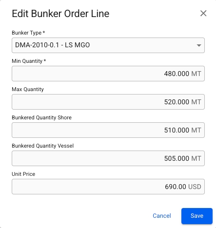 To edit the details of a bunker order line, such as bunker type, quantity, or unit price, click the order line to open a dialog where changes can be made. Refer to Figure 1 for more details.