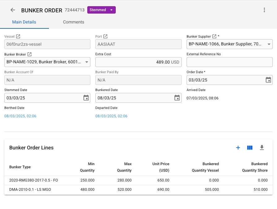 The details of a bunker order can be edited and maintained in the Bunker Order module.