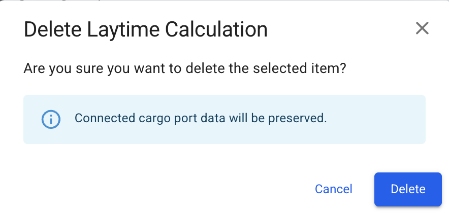 <figure><img src="https://content.gitbook.com/content/WoySkL2wtBxvxqGI8yWa/blobs/h66jMHfXQQLGPyg9qwk4/image.png" alt=""><figcaption><p>Confirm/ Laytime Calculation deletion modal</p></figcaption></figure>