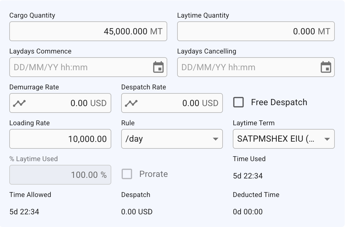 | <p>Despatch Rate<br>(<a href="../tiered-demurrage-despatch-rate"><em>supports tiered rates</em></a>)</p>  | The rate for despatch                                                 |