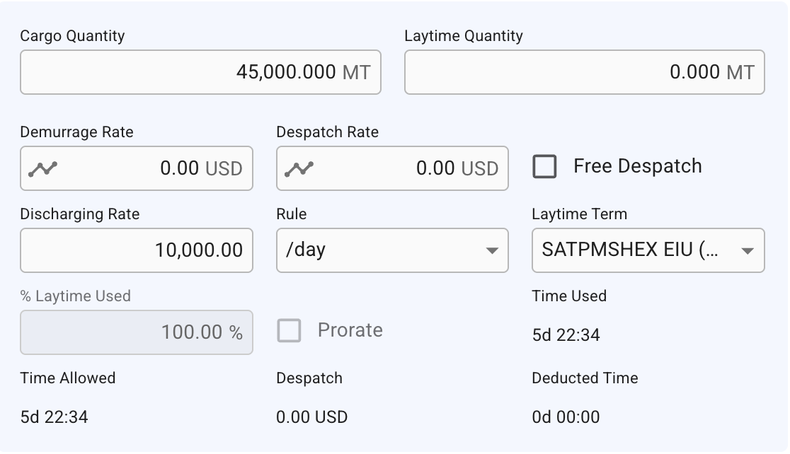<figure><img src="https://content.gitbook.com/content/WoySkL2wtBxvxqGI8yWa/blobs/Gka11FRdyz1Wh27KIYqA/image.png" alt=""><figcaption><p>Fields of Laytime Calculation Discharge Port</p></figcaption></figure>