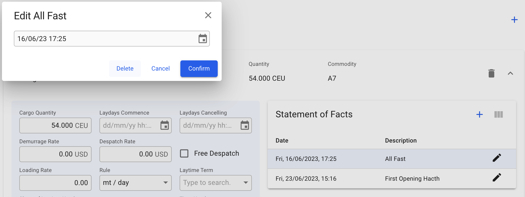 To edit or delete an event simply click on the the row that contains it, Here you can edit the date or select delete in the modal that appears and confirm - Note that this will delete it from the Statement of Facts list but **NOT** from the port log event list in the port call drawer while editing the date will effect both locations.