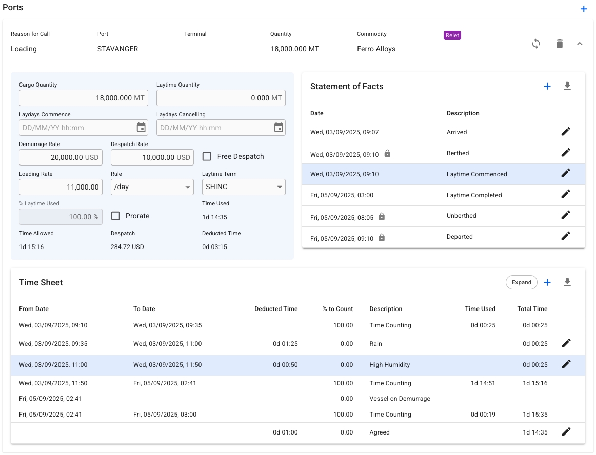 For example, if you click 🔄 'Synchronize Events & Deductions' on a SPOT (ref. figure 2), all events from the Relet cargo (ref. figure 1) will be copied to the SPOT (ref. figure 3).