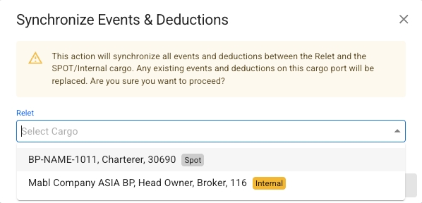 When synchronizing the relet, internal, or spot cargo, all laytime events, as well as the "not to count" events, will be copied from the corresponding cargo.