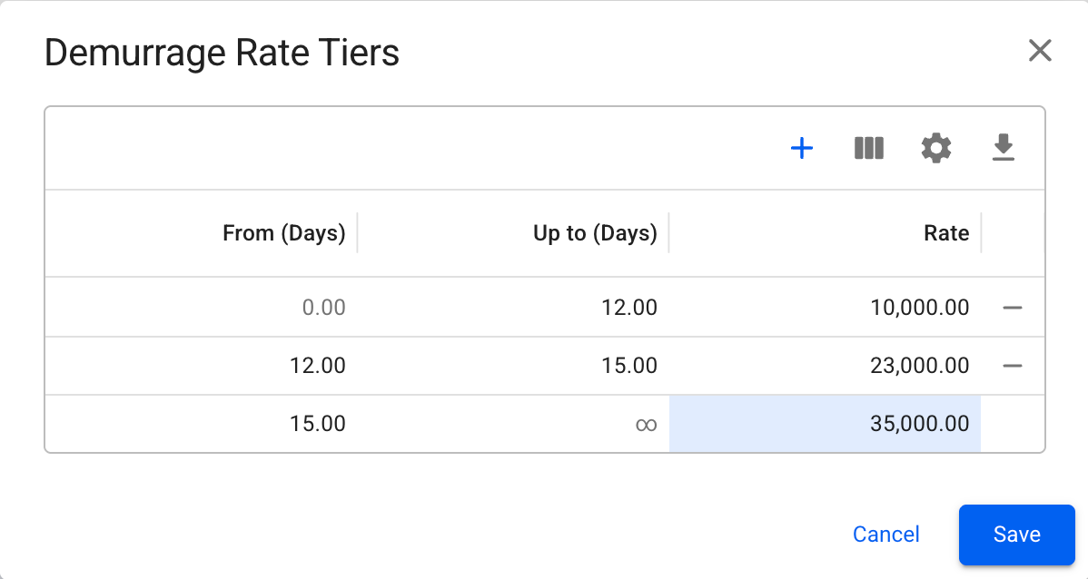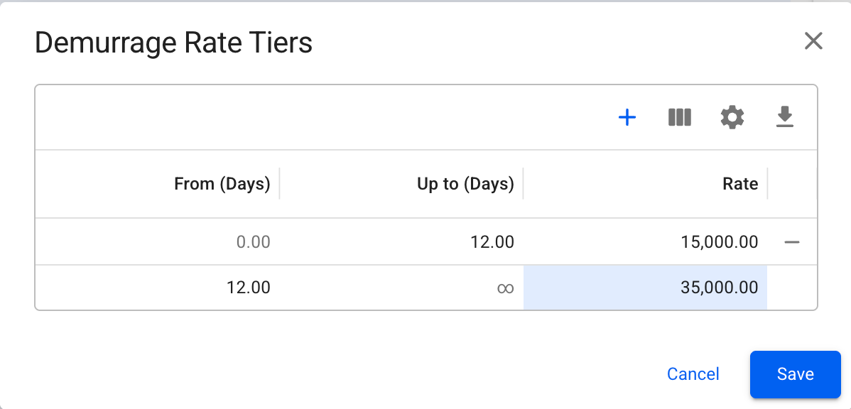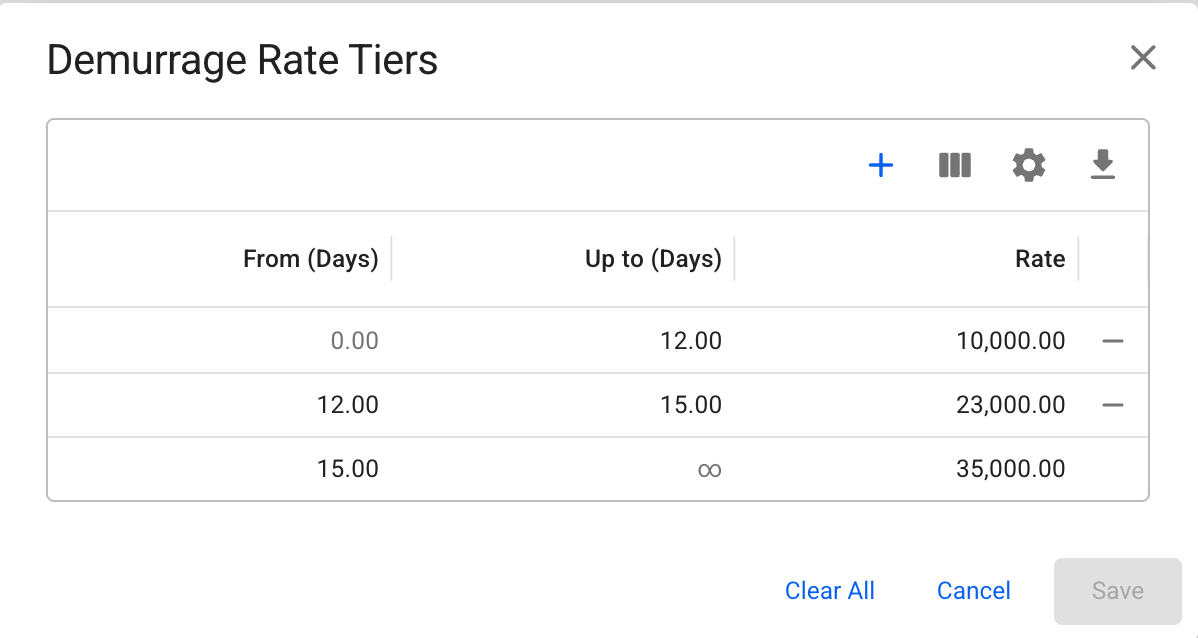 This page explains how to view, create, and manage demurrage and despatch rate tiers, including the rules that govern tier behavior and how to add, edit, or remove tiered rates