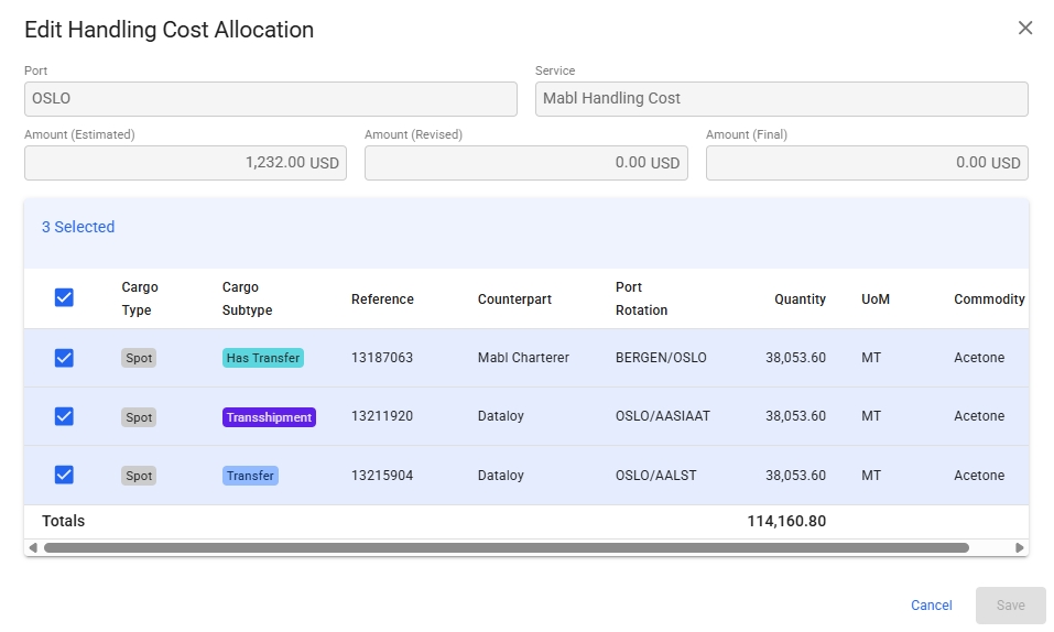 To edit which cargoes (cargo ports) should be included in the proration, click the 'Edit Allocation' button on a HCA line, and a modal will open (click to open in full):