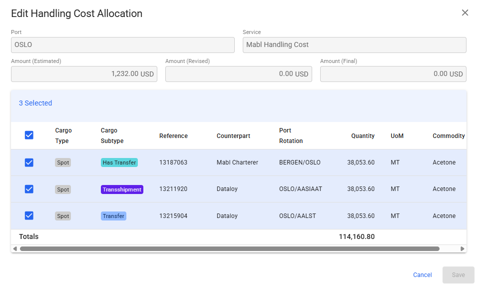 This is available from the HCA tab, at the top. Whenever you have transshipment cargo ports linked to this specific port call, you can decide to include them in the HCA proration by ticking the checkbox. You are then able to allocate/unallocate the transshipment cargoes as well, from the Edit Allocate modal view.