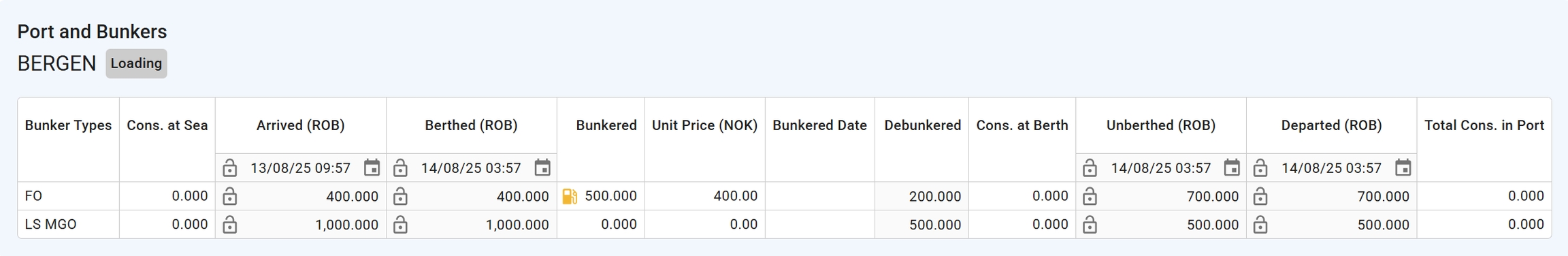 Starting with release 8.15, you can now enter a debunkered quantity in the Port Call drawer. This value is subtracted from the Unberthed Remaining On Board (ROB) and is priced from the earliest bunkers first. If the full debunkered quantity is not covered, the system continues with the next bunkers in sequence, following the same pricing order.