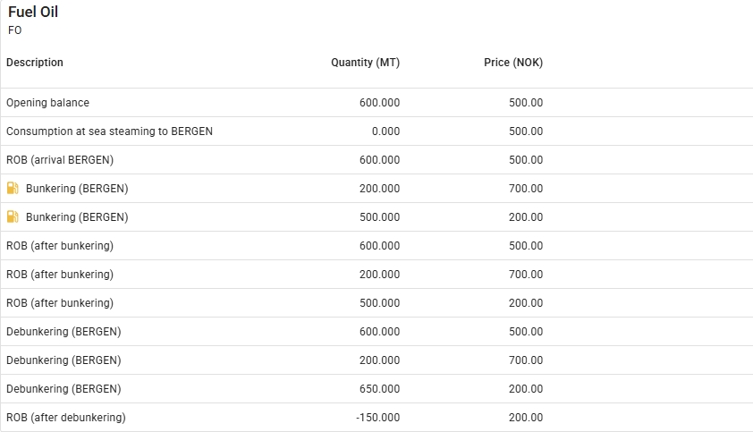 NOTE: If the debunkered amount is greater than the total bunkered, the remainder is subtracted at the last price. In this example, the final ROB is –150 MT at 200 NOK.
