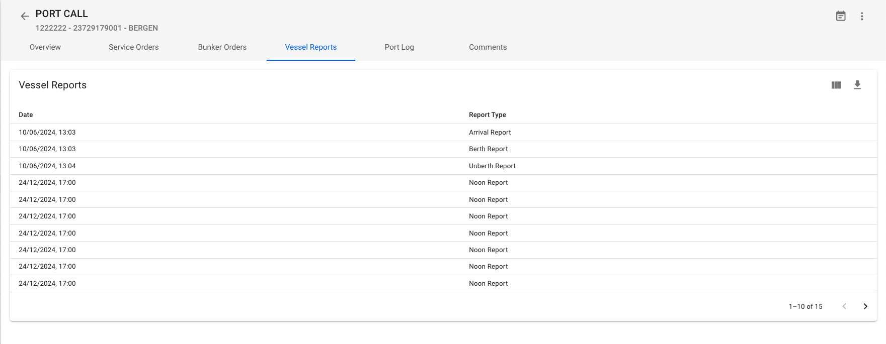To view Vessel Reports, open the drawer for the given Port Call by clicking it in the list. Then click the tab "Vessel Reports" at the top of the drawer and a list with registered reports will be displayed.