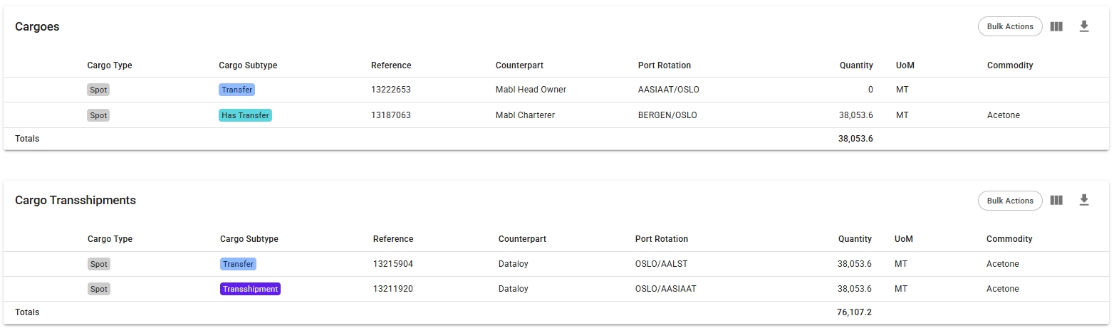 Here as well, note that the transshipments list will not be visible if this specific port call doesn't have any transshipment cargoes (or 'regular' cargoes) linked to it. Clicking on each of these cargo rows will open up the Cargo drawer, respectively.