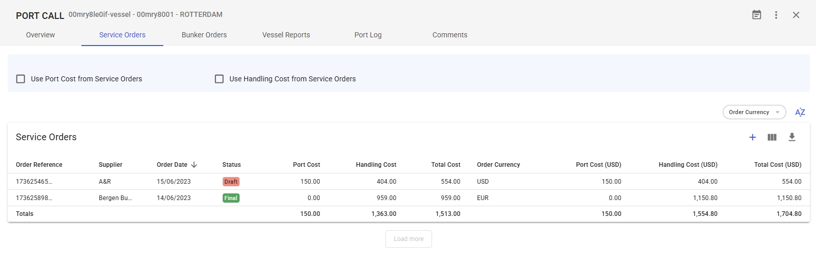 The total costs of the different service types for each service order line per service along with the total for the service order are displayed in their own columns. The different types being Port Cost, Handling Cost, and Various Cost. Port and Handling cost are displayed by default, and Various cost can be added by clicking the 'Customise Columns' button found beside the blue add button. The costs are displayed in both the order currency for that service order and the voyage currency, where the currency that is in parentheses is the voyage currency (click to open full view):