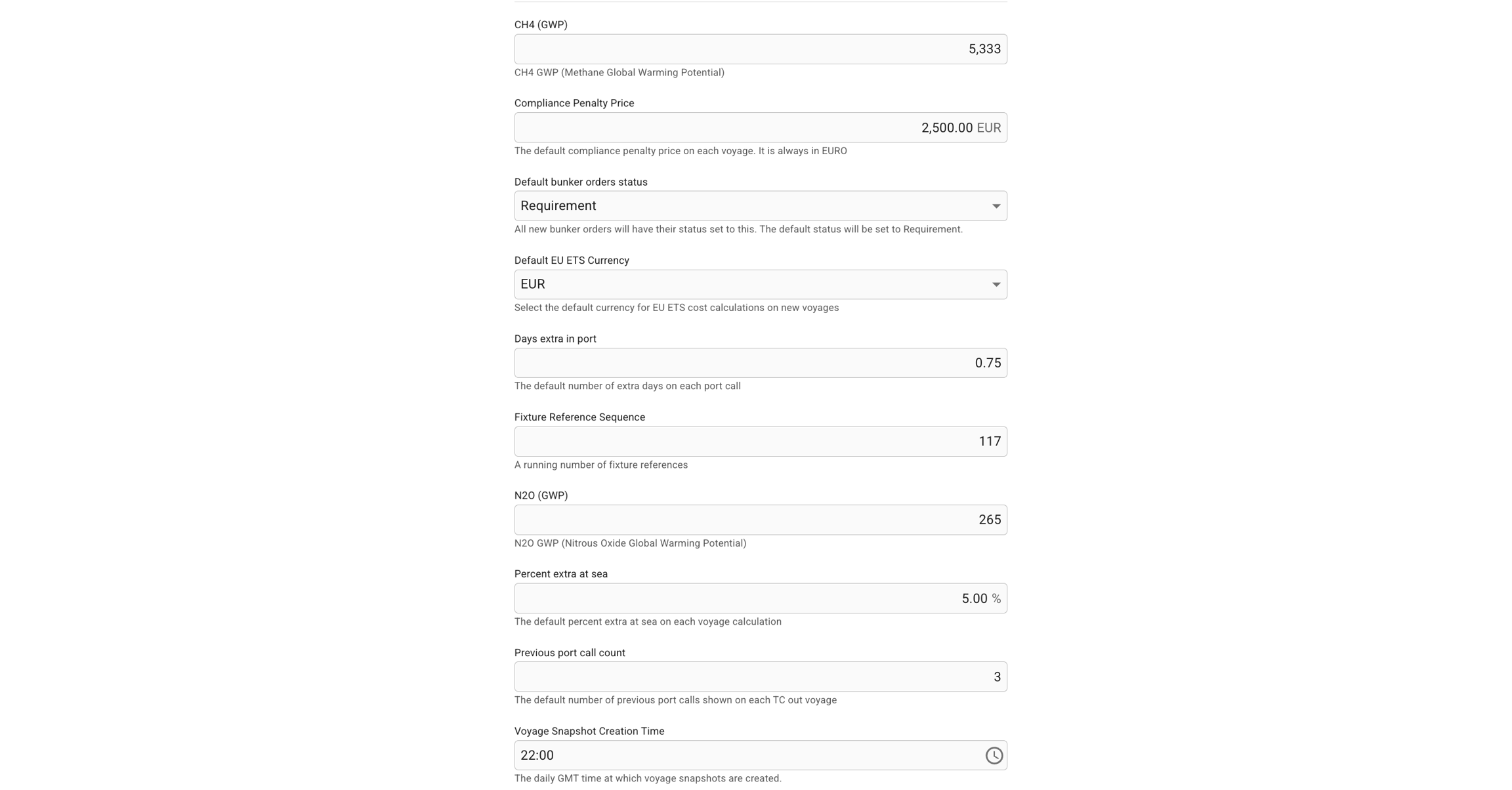 This setting is used to set the default currency for EU ETS cost calculations on new voyages. Note: Changing the setting will not affect previously created voyages.