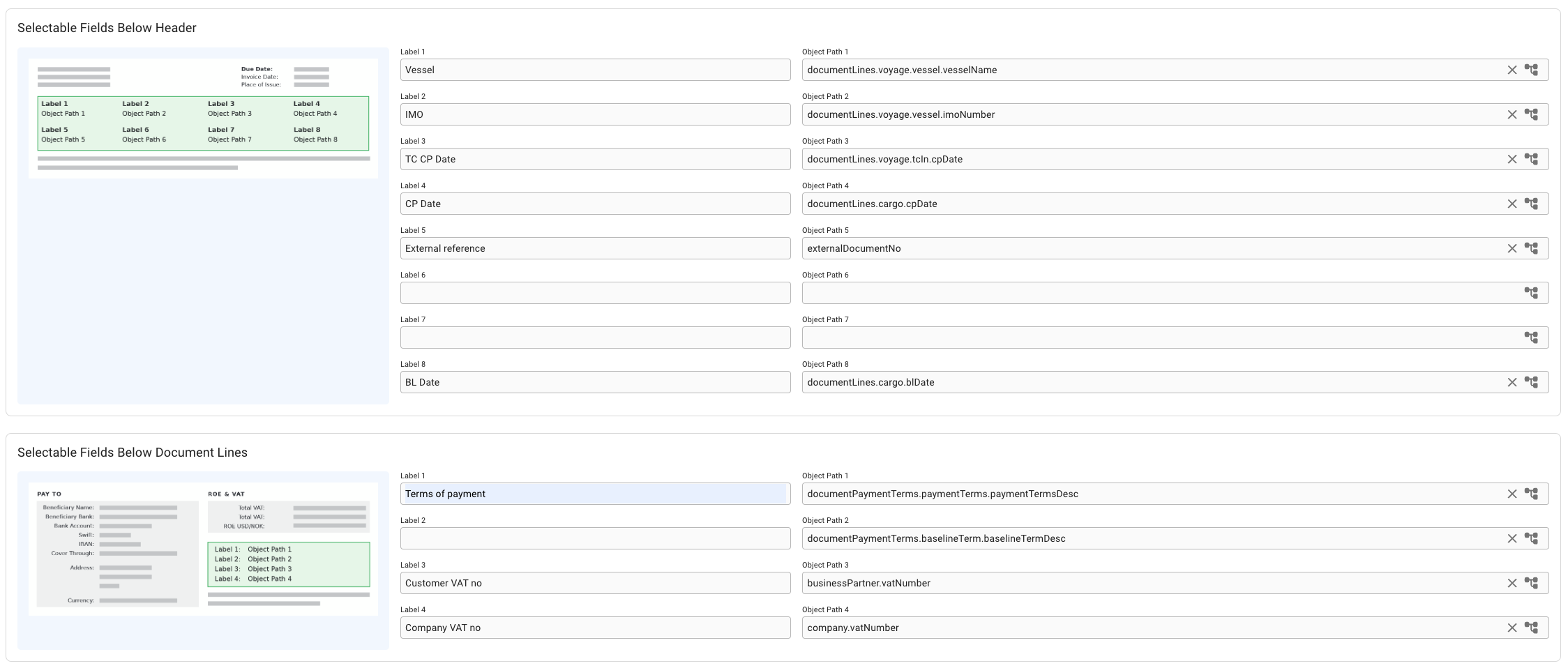 In Selectable Fields Below Header section, can choose up to 8 pairs of labels and object paths, while up to 4 pairs in Selectable Fields Below Document Lines section. The position of the labels and object paths are fixed, and can be referenced in the small preview picture in the blue area to the left. You can also read more about the invoice PDF itself here.