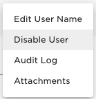 2. Open the actions menuand click Disable User. This will prevent the user account from logging in.