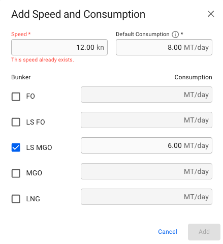 8 MT/day @ 12 knots for any bunker category during, but the consumption for the bunker category LS MGO is 6 MT/day @ the same speed (selected). The figure 2 illustrates how the Ballast Passage speed and consumption is configured in the create modal.