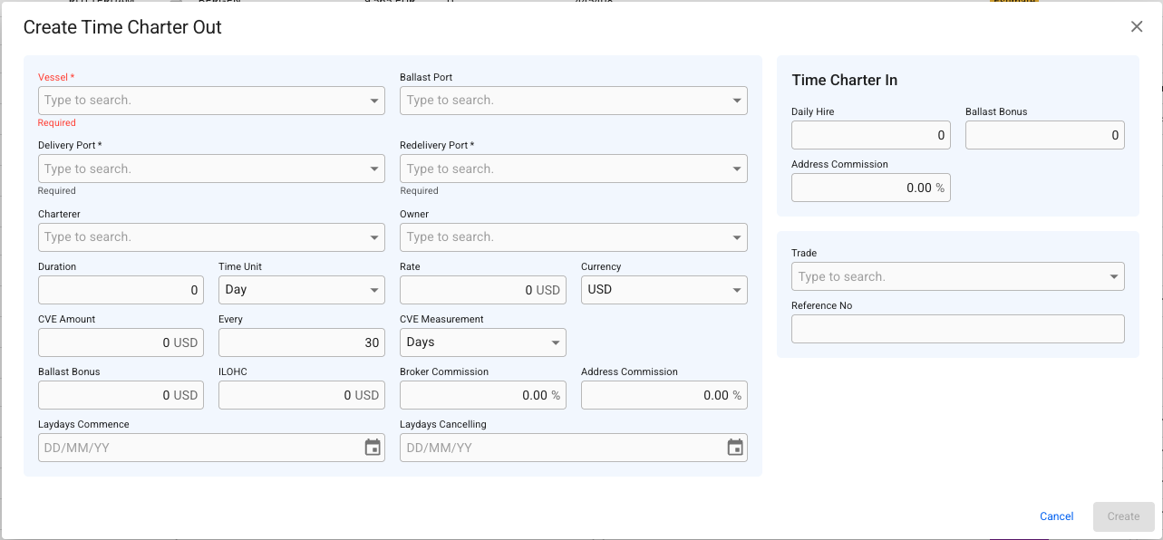 Create Time Charterer Out modal