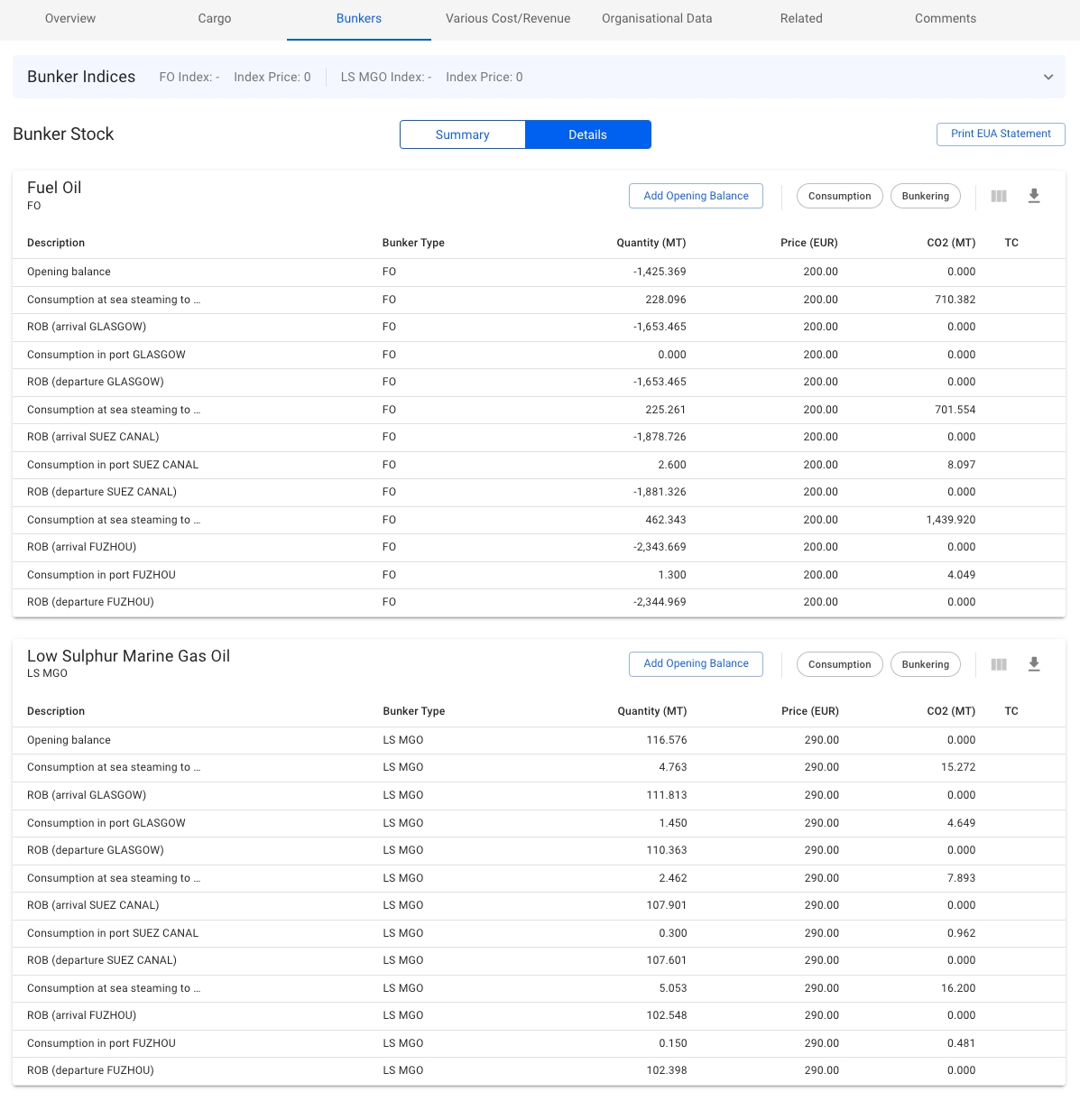 Yet, the Print EUA Statement button is always visible. This function generated a descriptive report of EU ETS consumed per port, specifying the percentage used in calculations, and associated consumption per leg.