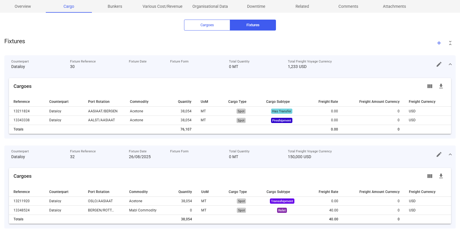 This tab shows a list of the cargoes and fixtures on the voyage.