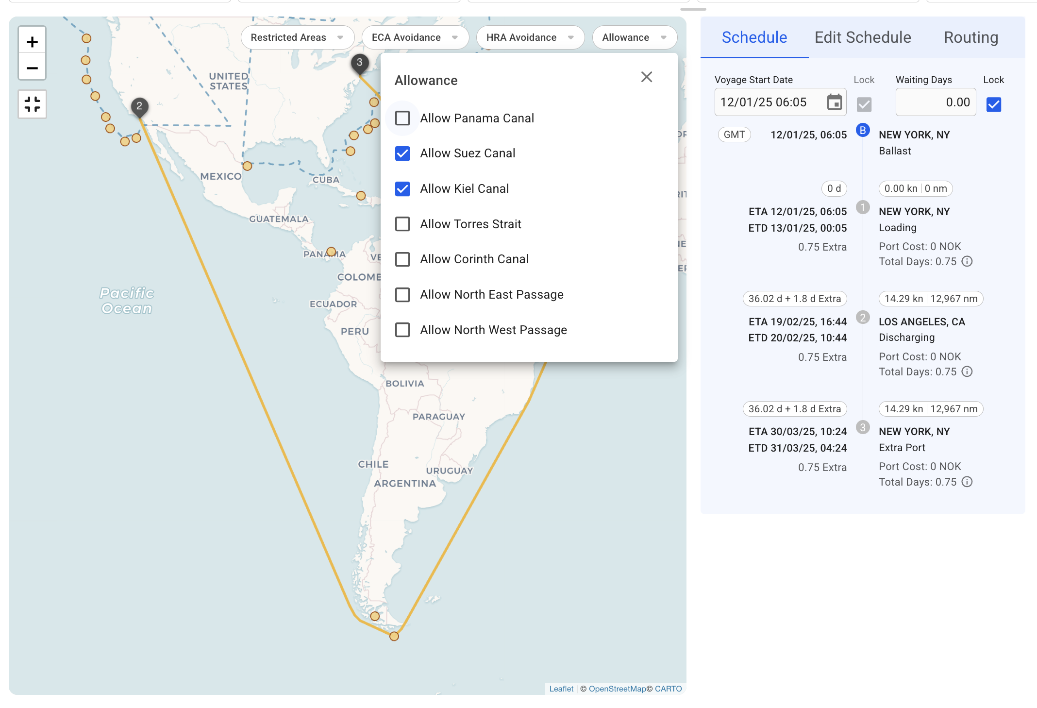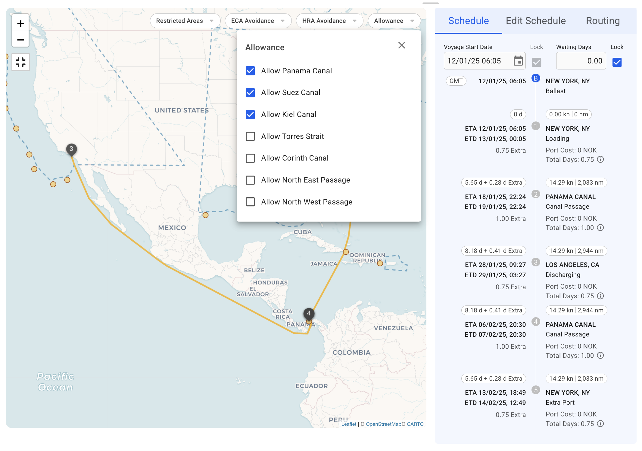 Canal Allowances Voyage Drawer The voyage is currently allowed through the Panama Canal, and the route and schedule reflects this. If Panama Canal is deselected in the allowance settings, all instances of the canal are removed from the voyage: